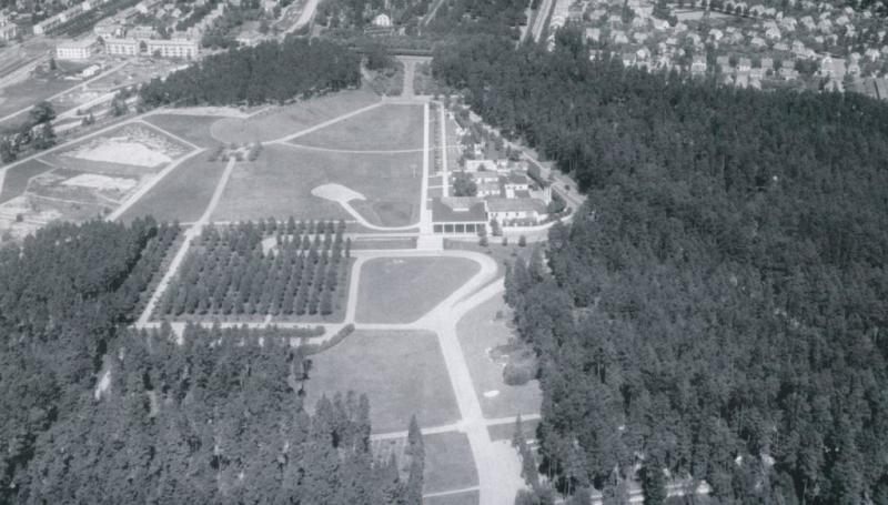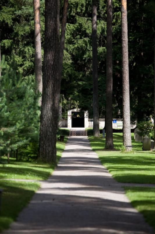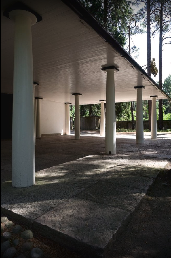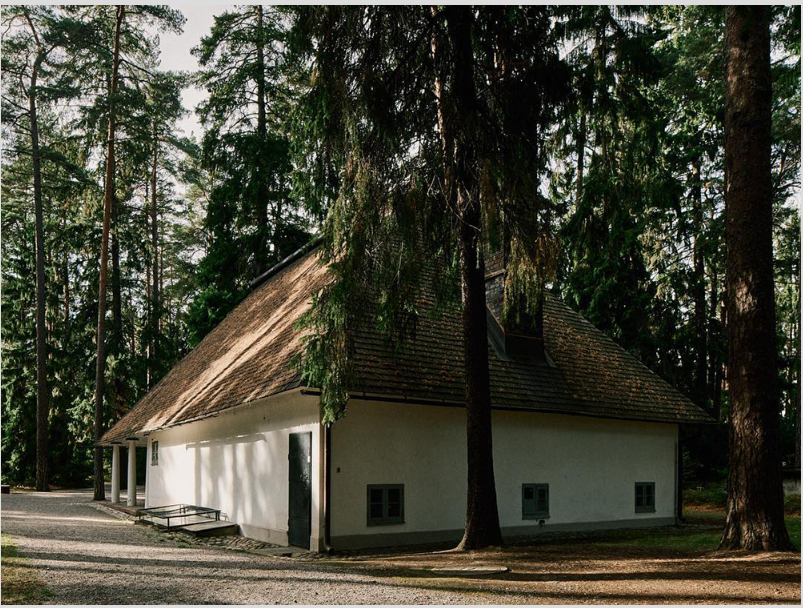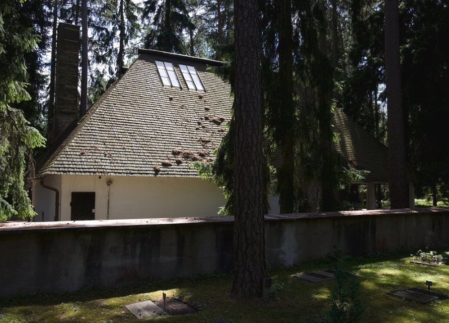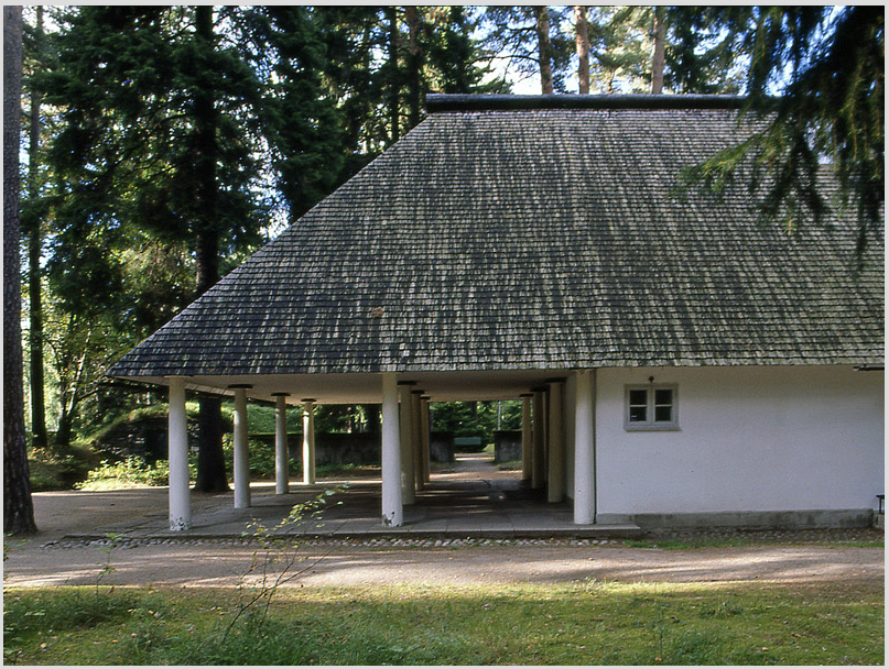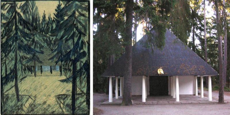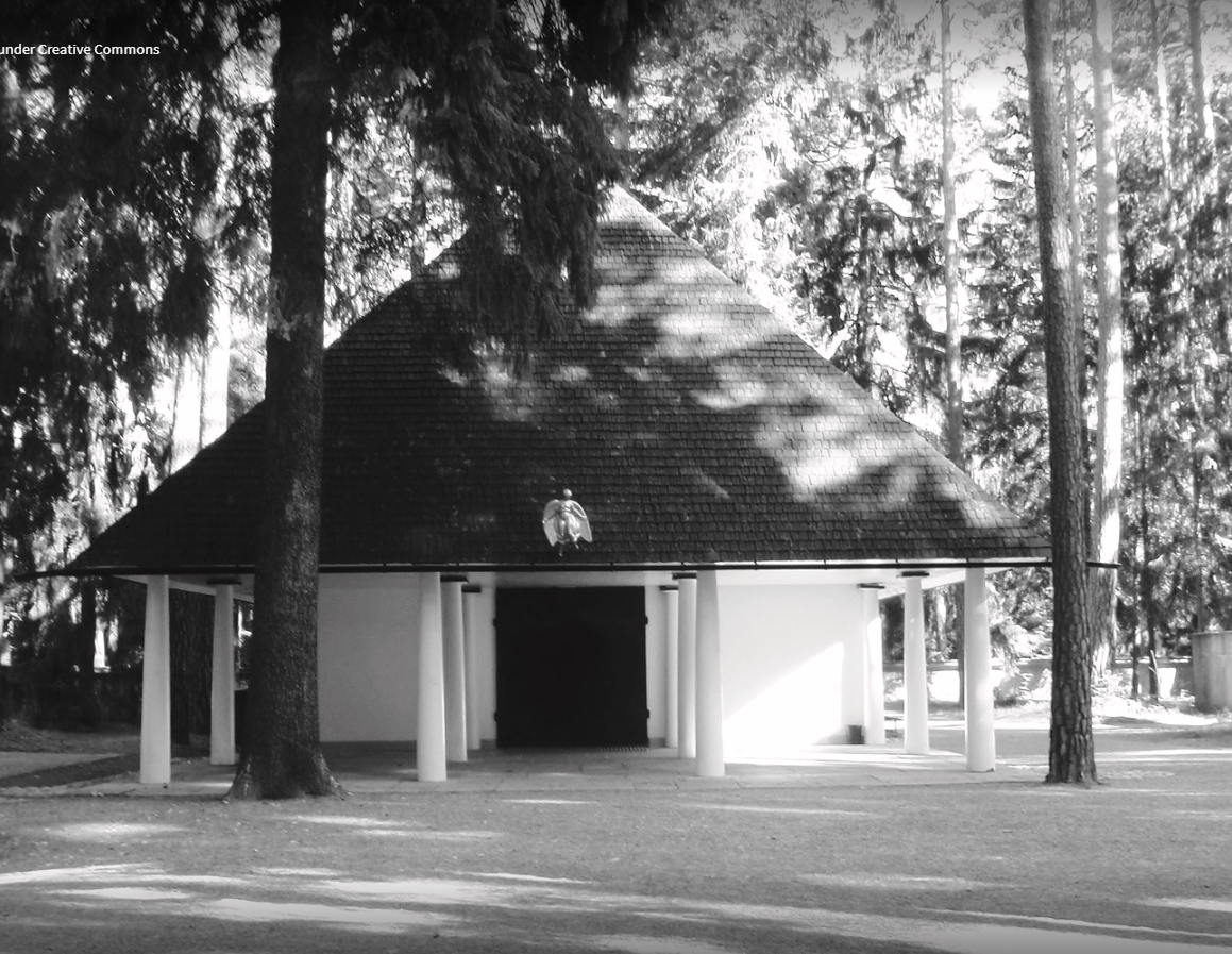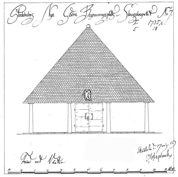 “En 1914, el Ayuntamiento de Estocolmo convocó un concurso internacional de arquitectura para la construcción de un nuevo cementerio. El lugar destinado era un terreno de casi 100 hectáreas junto a un bosque de pinos y abetos en el barrio de Enskede, al sur de la capital, de entre las 53 propuestas, se eligió la de los treintañeros Asplund y Lewerentz, presentada bajo el lema Tallum, apócope sueca de Pinar. Valorando que la característica fundamental de la propuesta es la preservación de la zona y sus propiedades de singular belleza. Desde un principio, los arquitectos habían decidido repartirse el trabajo: Asplund se dedicaría a los edificios mientras que Lewerentz se encargaría del paisajismo, de los recorridos y de los caminos. Así que en un pequeño claro que Lewerentz propuso, Asplund levantó la primera construcción del Cementerio: La Capilla del Bosque. En un inicio se propuso de piedra, pero por un problema con el coste de los materiales finalmente la capilla sería de madera. Y así fue: un árbol de madera entre árboles de madera. Sí, el aspecto de la Capilla del Bosque es vernáculo y romántico —columnas dóricas, cubiertas inclinadas, materiales tradicionales—, pero el tratamiento es profunda e inherentemente singular: la manipulación de los elementos en una búsqueda precisa”.
