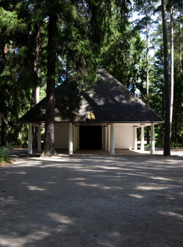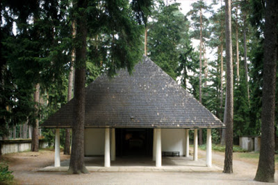 El edificio singular más convincente que surgió de estas fases iniciales de la creación del cementerio fue la Capilla del Bosque, proyectada por Asplund en solitario entre 1918 y 1920. Esta capilla estaba colocada en un eje transversal del cementerio, al final de un sendero a través de las coníferas y precedida de un pequeño pórtico rectangular nítidamente definido que sostenía un frontón totalmente simplificado. La propia capilla era una ingeniosa combinación del templo clásico y la cabaña nórdica. El recinto combinaba la idea de una iglesia rural escandinava con un temenos clásico. A un lado había un pequeño túmulo funerario y al otro una cancela baja con un suelo en forma de disco. En realidad la propia capilla era una versión rústica en miniatura del Panteón, sobre la que se había colocado una cubierta muy empinada revestida de tejas de madera. La cubierta terminaba por abajo en un borde afilado que obstaculizaba la visión de los capiteles dóricos de las esbeltas columnas de madera que formaban el pórtico. Por eso, vista desde el frente, la cubierta parecía flotar sobre cilindros blancos de madera que evocaban los troncos de los árboles circundantes. Las líneas diagonales y en pendiente de la cubierta, con sus superficies con textura de madera, también armonizaban con la inclinación hacia abajo de las ramas de las coníferas que la rodeaban. La figura triangular, recordaba inevitablemente la imagen de un esquemático frontón clásico, y provocaba así una cadena de asociaciones primitivas relativas a los posibles orígenes de los elementos clásicos en las formas de las cabañas o incluso, en las formas de la naturaleza, al mismo tiempo evocaba la idea de una pirámide que flotaba ligeramente por encima del terreno.