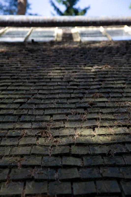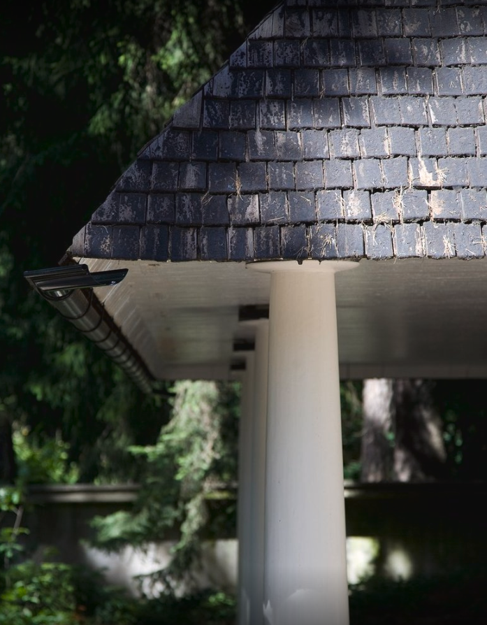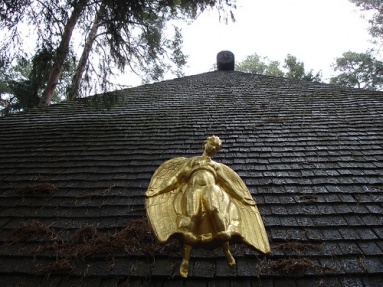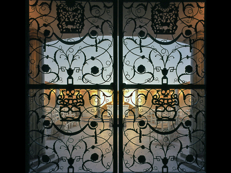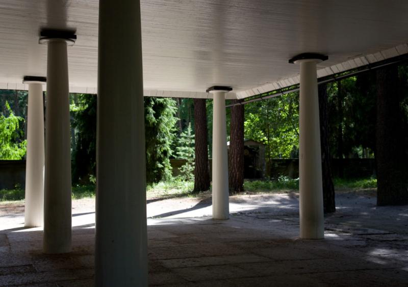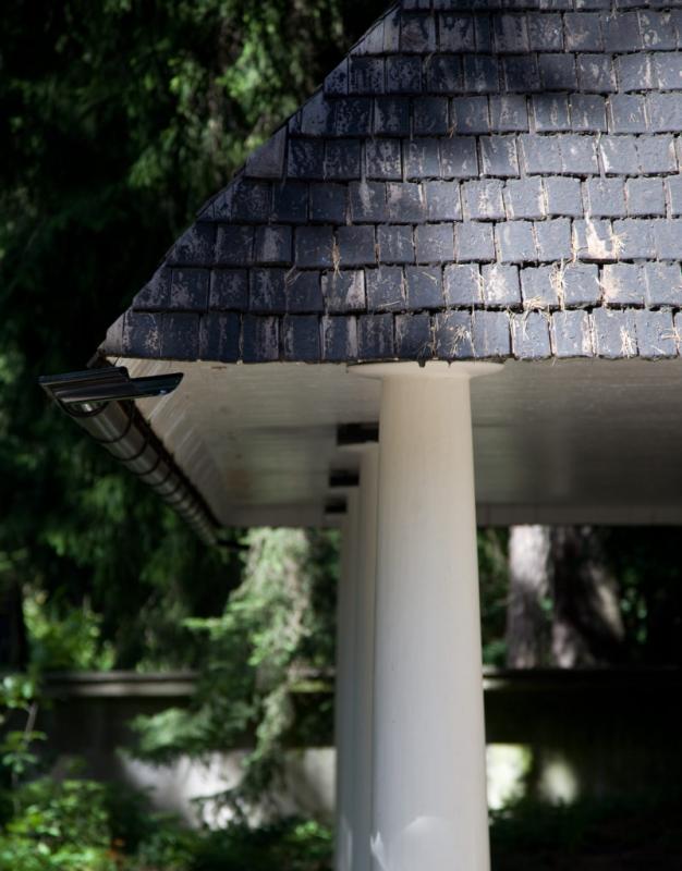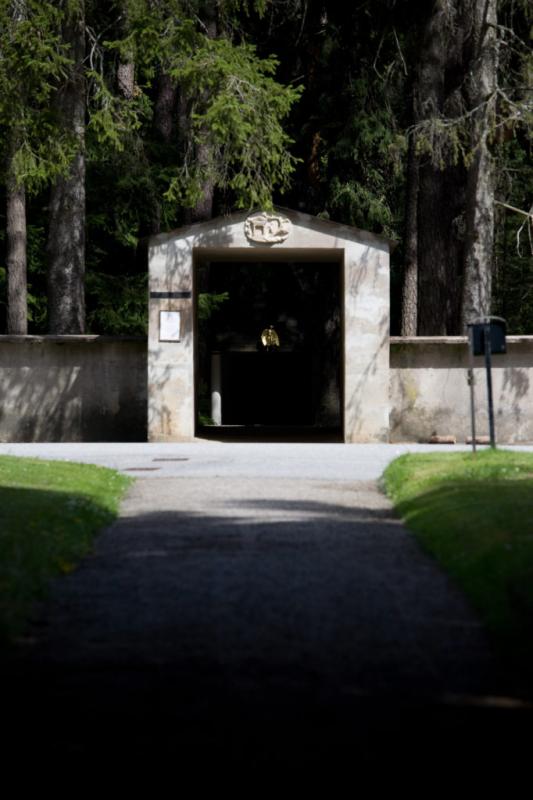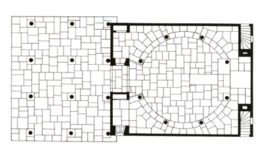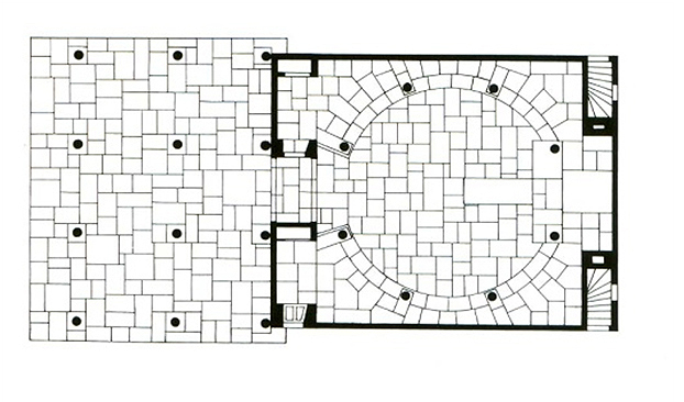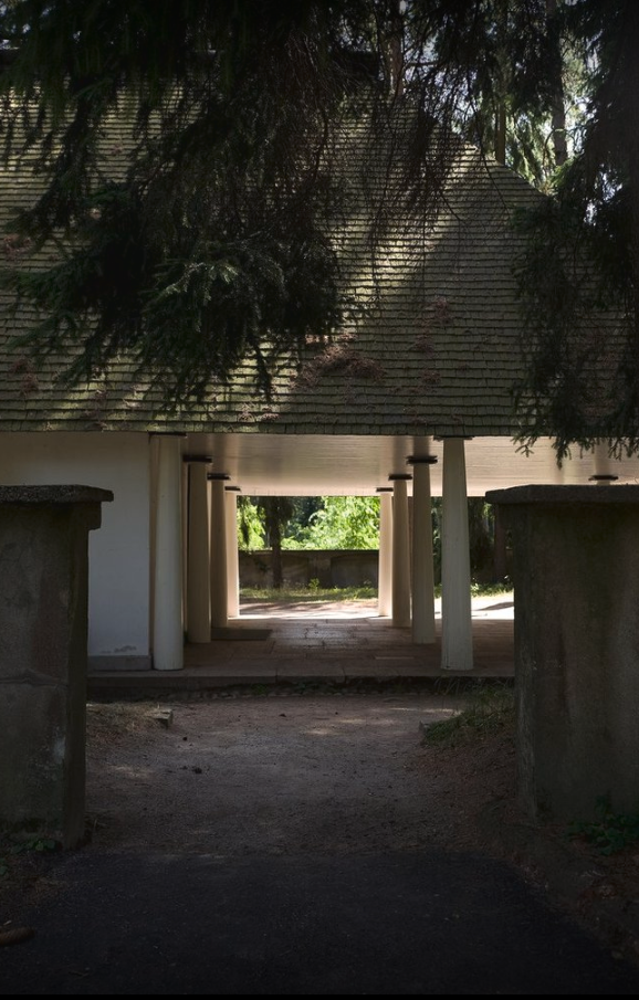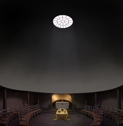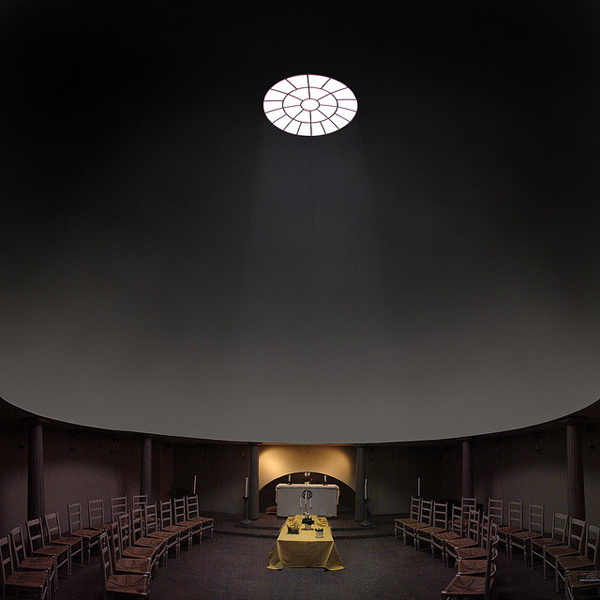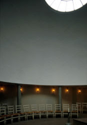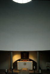 Este ámbito es de espera, antes de abrir las robustas puertas que cierran la capilla. Abiertas éstas, una reja de delicadísimo trazado se abre al recinto, donde la bóveda esférica invade de luz el recinto. El edifico, al aproximarse a él de frente, se presenta como una pirámide. Una pirámide oscura, debido a las tejas o shingles de madera de la cubierta, soportada por ese „bosque“ de columnas blancas del pórtico. La pirámide, o mejor la cumbrera de la cubierta, soporta un tronco yacente, horizontal, operando simbólicamente como un catafalco."