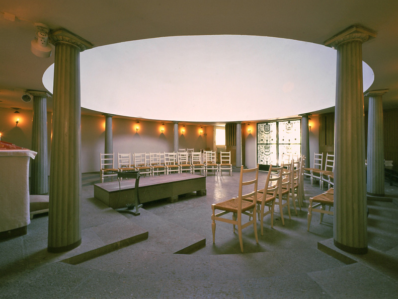 En contraste con el exterior, rústico y con textura, el interior de la capilla era liso, lumoinoso y claro. La cúpula tenía un perfil rebajado, pero estaba iluminada cenitalmente mediante una linterna, mientas que por abajo el suelo estaba recortado para hacerse eco de la forma circular de arriba. Esto no sólo repetía un tema cilíndrico que se encuentra en otros lugares del cementerio - donde unos pocos circulares estaban rehundidos en el terreno- sino que creaba una versión regular de un claro en el bosque bajo un cielo simbólico. La planta respondía a los rituales de los entierros: llegada, condolencia, reunión, transición, concentración, último rito, regreso, procesión y enterramiento. La sección era un microcosmos de temas también presentes en otros lugares del cementerio que conectaba el mundo terrenal con el reino celestial. Asplund fue capaz de insuflar nueva vida a unos tipos clásicos familiares con un contenido relacionado con la función que debía cumplir el edificio.