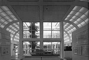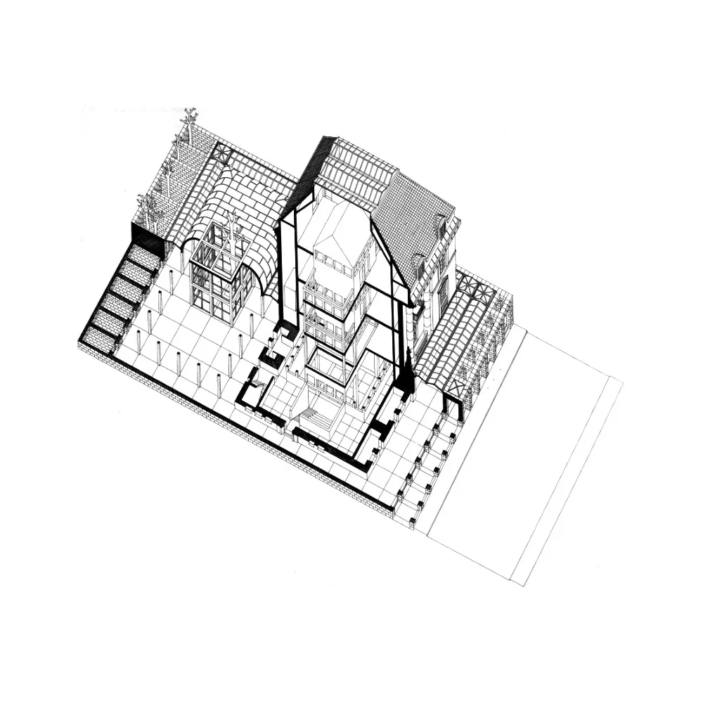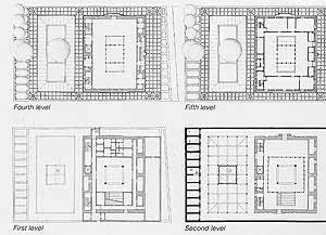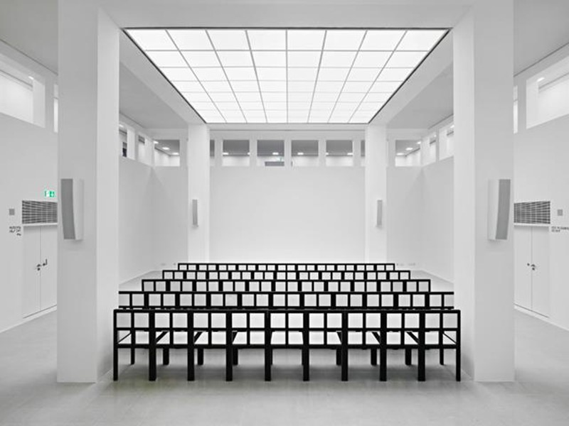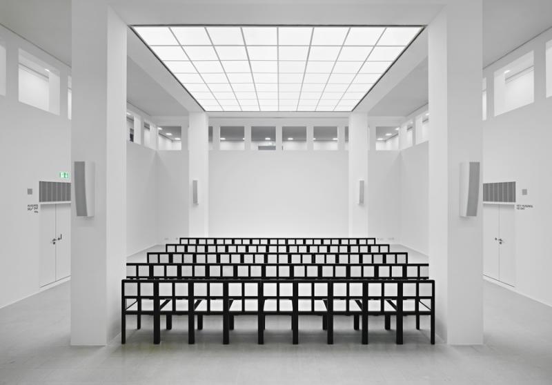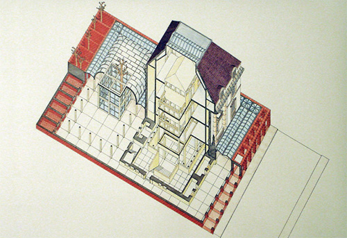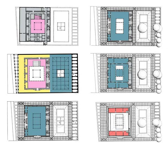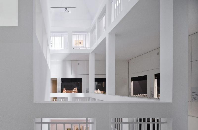 En su interior, el nuevo núcleo del edificio de 5x5 metros se extiende hacia la parte superior por medio de 4 pilares, estando  encerrado en sí mismo, es decir, la fachada existente del 1912 queda intacta y guarda en su interior un núcleo, siendo este el centro del museo. Los 4 pilares sostienen en la parte superior un techo protector, aludiendo a la sencilla idea de que, bajo un techo, quien sea encontrará la seguridad necesaria. Alrededor de dicho núcleo, se disponen los accesos, corredores y zonas de servicio que crean un espacio entre la fachada original y los 4 pilares. Al sur, quedan los patios, una zona también modulada como todo su interior utilizada como zona de descanso y expansión. “El edificio dentro del edificio” queda protegido del exterior, los accesos, corredores y patios que lo conforman crean una ciudad en miniatura alejada del ruido del tráfico de las calles.