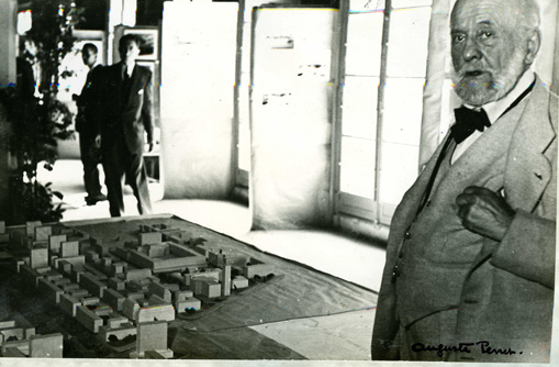 ...Análoga interacción entre las tendencias clasicistas y las necesidades técnicas subraya la labor de Auguste Perret, mas no deben buscarse mayores similitudes entre éste y Garnier. Como ya se ha dicho, Perret abandonó la École des Beaux-Arts en 1895 —antes de completar los cursos, pero después de mostrar una considerable aptitud para sus estudios—, a fin de consagrarse a los negocios de construcción de su padre. A partir de 1890, año de su ingreso en la École, había realizado proyectos por su cuenta; de esta suerte, poseía casi desde un comienzo esa combinación de arquitecto y hombre práctico de negocios que lo hace comparable en importancia a Peter Behrens, y también en cuanto a la influencia que ejercerá sobre la generación que entonces surgía. Pues parece claro que estos dos clasicistas de transición figuraron entre los hombres de mayor peso en la formación de la generación que produjo, más bien que encabezó, la arquitectura moderna.