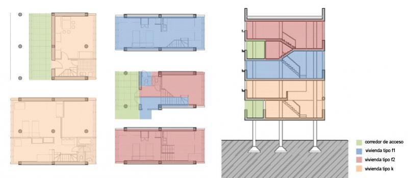 La OSA dedicó mucho tiempo a los estudios de viviendas, examinando cuestiones como la célula familiar funcional, los estándares mínimos acordes con la producción en serie, y el significado de diferentes espacios de acceso. El edificio Narkomfín fue un laboratorio de sus investigaciones sociales; combinaba toda una variedad de unidades unifamiliares 'tipo F', el mínimo, con unidades mayores 'tipo K' con tres habitaciones en dos niveles. La sección del edificio en conjunto era una ingeniosa creación que usaba una disposición tres sobre dos. De este modo, las salas de estar, situadas a uno de los lados del edificio, podían ser amplias de altura y estar bien iluminadas, mientras que los dormitorios y los cuartos de baño podían ser más pequeños, más económicos en el uso del espacio y podían estar incluidos al otro lado del edificio. Pero esta disposición funcional tenía propiedades adicionales: el sistema 3:2 permitía ensartar las plataformas de acceso a lo largo de todo el edificio cada tres niveles, y formar un rompecabezas con las viviendas de modo que se pudiese disfrutar de la luz y las vistas en los dos lados. No obstante, estas 'calles-plataforma' eran algo más que meros corredores funcionales de acceso ; podrían considerarse elementos simbólicos que expresaban las aspiraciones comunitarias; en el edificio Narkomfín , de hecho, tenían calefacción para favorecer los contactos a lo largo de todo el año. Las otras partes comunitarias del edificio, como la cantina, la cocina, el gimnasio, la biblioteca y la guardería se encontraban en un prosaico elemento rectangular unido al volumen principal mediante un puente. Esa idea de Le Corbusier de la terraza de cubierta se empleaba aquí como un espacio comunitario adicional para usarse en los meses de verano.