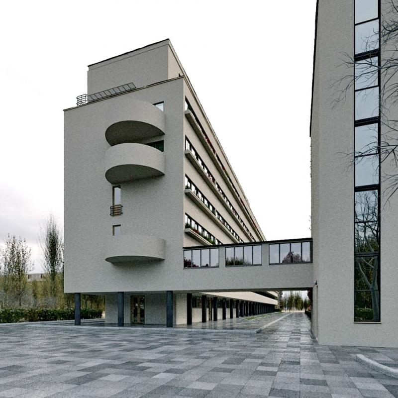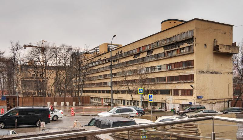 Un producto típico del grupo fue el edificio de apartamentos Narkomfín , construido en Moscú en 1928-1930. El concepto marcaba una transición entre la casa tradicional de viviendas que contenía pisos completamente privados, y un nuevo tipo de alojamiento comunitario en el que algunas zonas eran comunes, y en el que se buscaba un equilibrio razonable entre el individuo, la familia y el grupo social más amplio . El impacto del vocabulario formal de Le Corbusier era indiscutible: las viviendas estaban contenidas dentro de una caja larga y baja, levantada del suelo mediante pilotis, y la ventana corrida se usaba como un recurso primordial para articular el conjunto.
