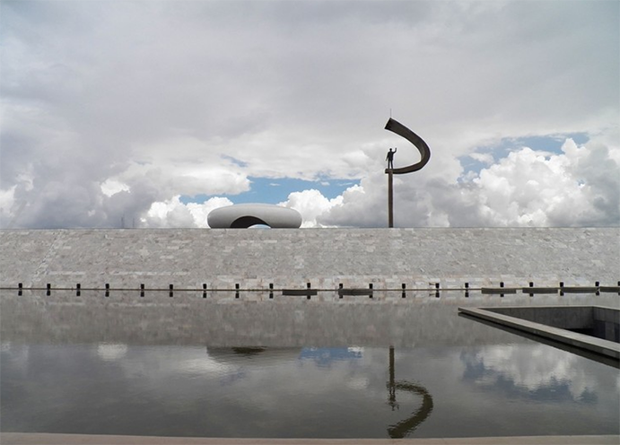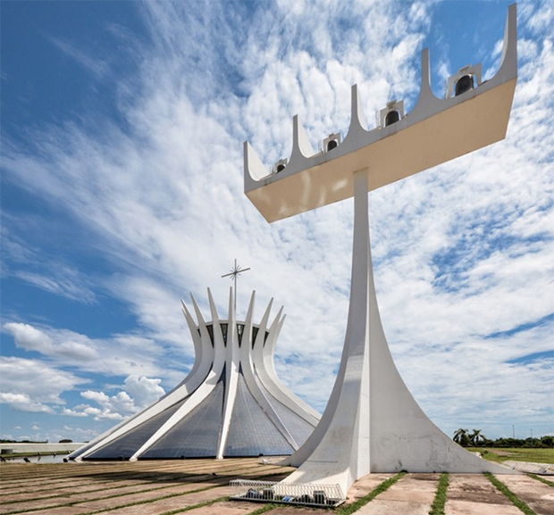 En los países de la América Latina de los años 1950 donde preocupaba la representación arquitectónica del estado, había una doble presión para simbolizar el progreso exaltar los mitos nacionales. La monumentalidad mexicana que surgió en este periodo tenía que ver con la centralización de las instituciones y con la consolidación de una visión 'abarcadora' de la cultura nacional que se apoyaba en el extenso patrimonio precolombino. Pero Brasil no poseía equivalente alguno de esas ruinas antiguas, y cuando Lúcio Costatrazó el plano para la nueva ciudad de Brasilia y Óscar Niemeyerproyectó las principales instituciones estatales en su Capitolio, ambos elaboraron un lenguaje general de la monumentalidad usando para ello medios principalmente modernos. La ideología latente en el programa suponía lanzarse a un futuro desconocido y a algo parecido a un gesto cósmico para establecer un lugar simbólico en el vasto paisaje virgen del interior brasileño Aunque el proyecto para Brasilia estaba rodeado por la retórica tecnocrática de mediados del siglo XX, también reiteraba ese viejo sueño colonial de expandirse hacia el corazón del país. El plan urbanístico de Costa se asemejaba tanto a un avión con sus alas extendidas formando un suave arco, como a una cruz trazada en el paisaje. El punto focal era la plaza de los Tres Poderes, que contenía el Palacio Presidencial, el Tribunal Supremo y el Congreso con su Secretariado. El bloque escindido de este Secretariado se alzaba entre las principales Cámaras del estado, que se expresaban como dos formas de cuenco, uno boca arriba y otro boca abajo. La hendidura entre los prismas marcaba el eje de la ciudad y lo lanzaba sobre el vasto espacio del continente hacia el infinito. A ambos lados del eje estaban los ministerios, también prismas alargados con fachadas acristaladas, pero esta vez colocados de costado. Completaba este conjunto de figuras abstractas la catedral (1959-1970), con su manojo de vigas curvas que contribuían a crear una figura hiperboloide, pero que también complementaban los espacios totalmente abiertos e impulsaban la vista hacia el cielo.