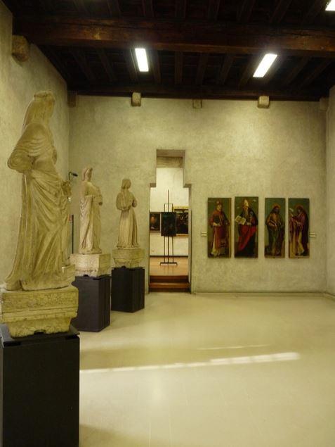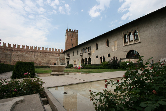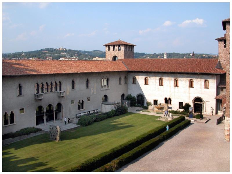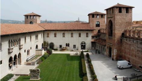 Las salas de exposición provienen de laépoca napoleónica y están dispuestas en "hilera", como una secuencia de salas. para la decoración, Scarpa empleó intencionalmente materiales sencillos, alternados conepisodios esmeradamente diseñados a modo de marcos que comentan las obras expuestas. El revoque, a base de cal apagada, es más o menos áspero, dependiendo de la granulometría de los áridos agregados. Los pisos sonde cemento y están subdivididos endiversas áreas enmarcadas con piedra de Prun. Las paredes de los pasajes con arcos de medio punto fueron revestias con grandes placas rugosas de piedra roa de Prun, como las que demarcan las antiguas fincas. Una puerta en arco con una reja de acero se abre a la zona del gran patio interior, donde se encuentra la estatua de Cangrande. Un laberinto de escalones, al estilo de Piranesi, conduce en varios niveles al patio interior oeste. Se llega desde allí hasta la torre del Mastio y después al ala que presenta pinturas de pintores veroneses y venecianos, además de algunas esculturas del período que va desde la Edad Media hasta el siglo XV. Desde allí se regresa al antiguo cuartel. También se puede elegir el camino a lo largo de las almenas, para terminar el recorrido en la galería que contiene pinturas el período comprendido entre los siglos XV y XVIII.