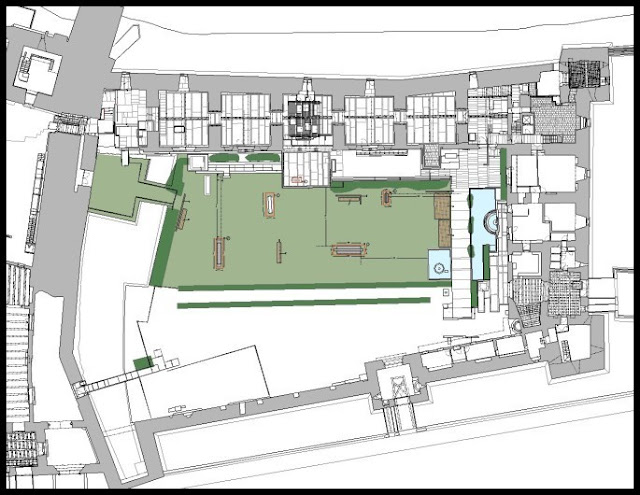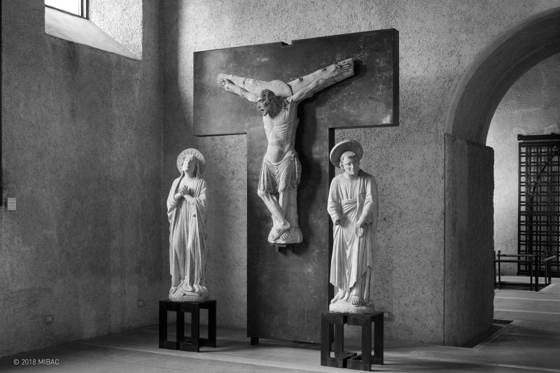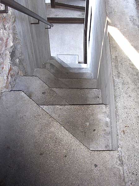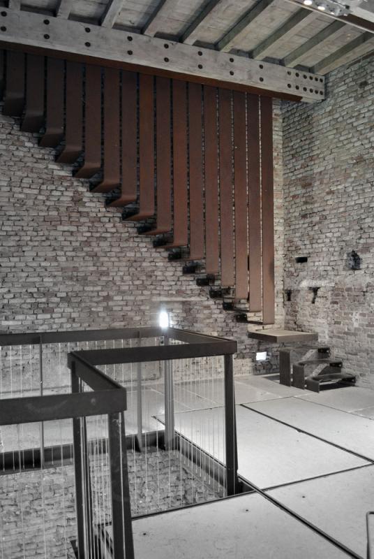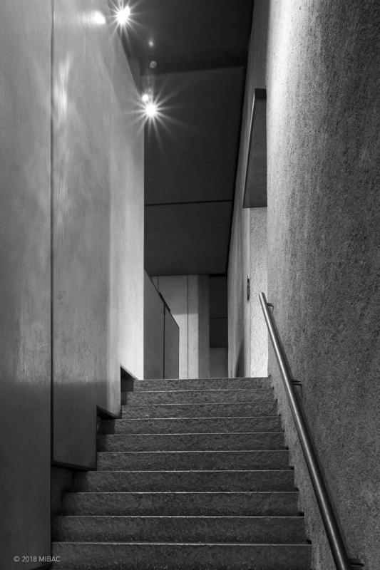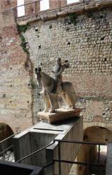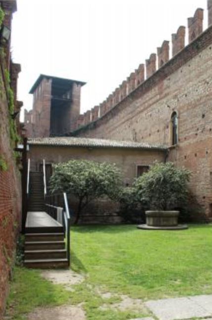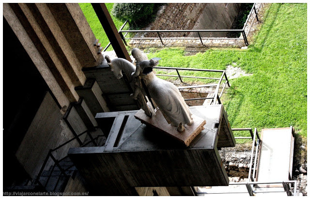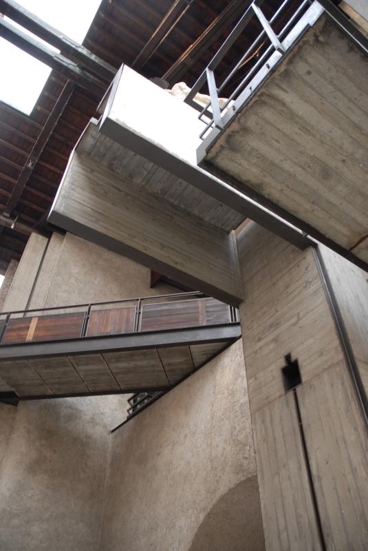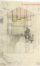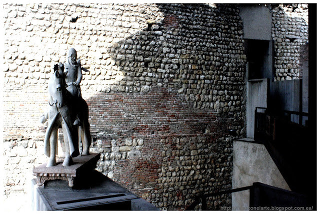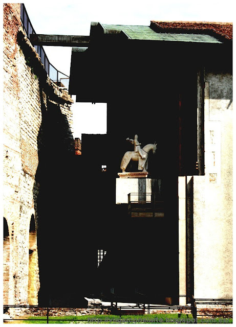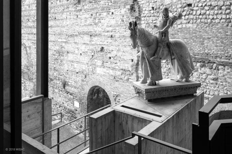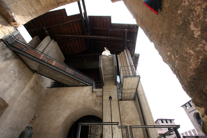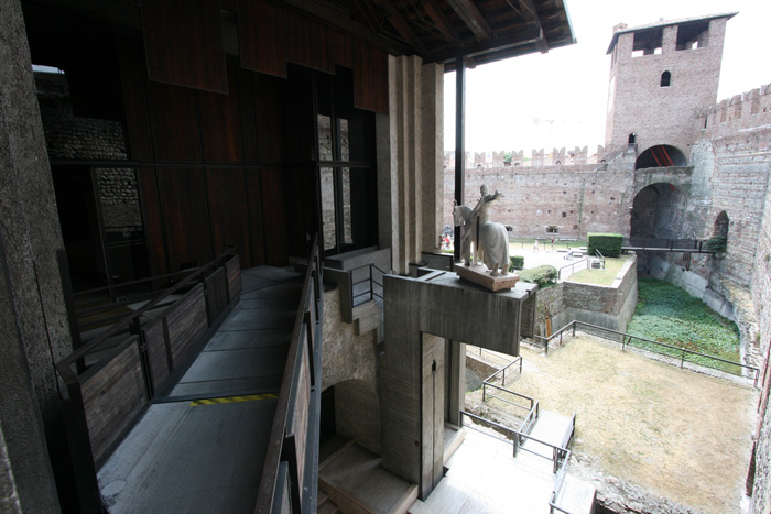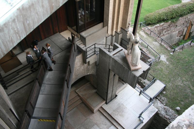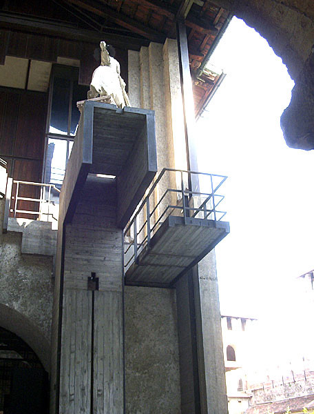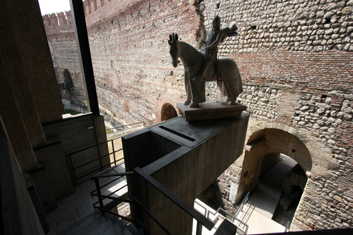 El espectacular foco central de este escenario histórico era la unión de dos de los edificios, donde Scarpa acentuaba el tema de la ruptura mediante una mampostería dentada y unas plataformas de hormigón salientes, una de las cuales sostenía una estatua ecuestre medieval.