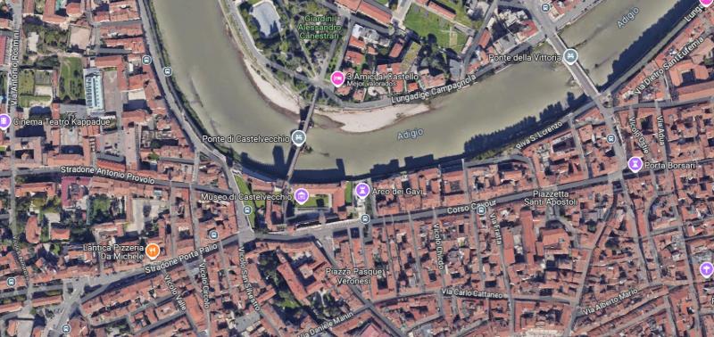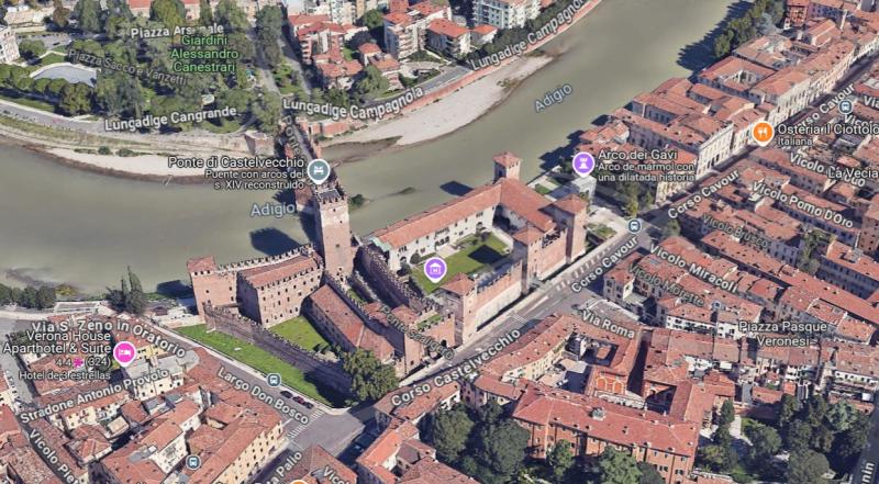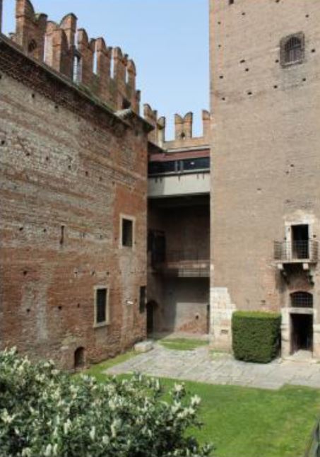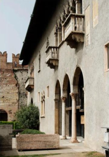 "En Castelvecchio todo era una ilusnión", dijo Scarpa en Madrid en 1978 a propósito de la fachada, al patio. "Decidí añadir algunos elementos verticales para interrumpir la simetría. El gótico lo exigía; y el gótico, sobre todo el veneciano, no es simétrico". Sin embargo diversos argumentos llevaron a dejar la fachada aparentemente intacta, aun cuando su "simetría artificial" fue "rota" por algunas intervenciones. En espacial, se desplazó la entrada del centro. Scarpa quería que la fachada se pudiera reconocer claramente como un telón, lo que logró, en especial, con el diseño de las ventanas. Obviamente, las ventanas no se refieren a la fachada, sino a las paredes interiores: la conciliación de esas parredes interiores conel patio la realizan elementos salientes, como el muro en la entrada o los solados prolongados hasta el exterior.