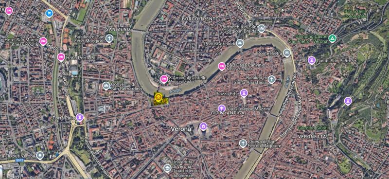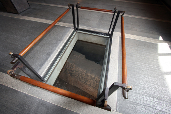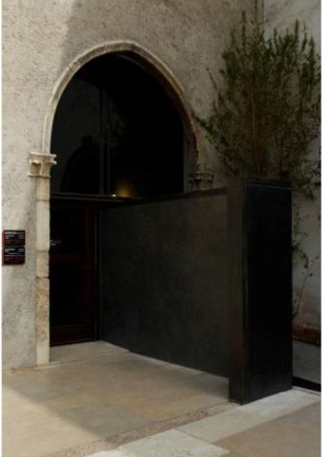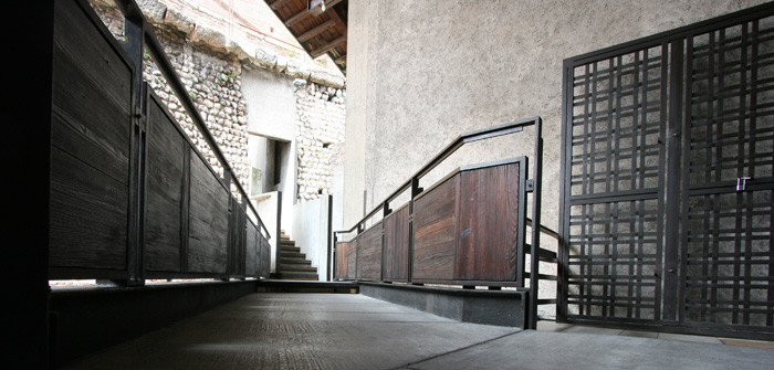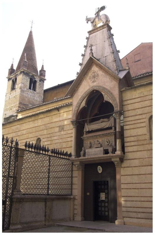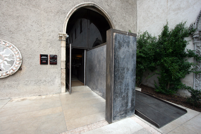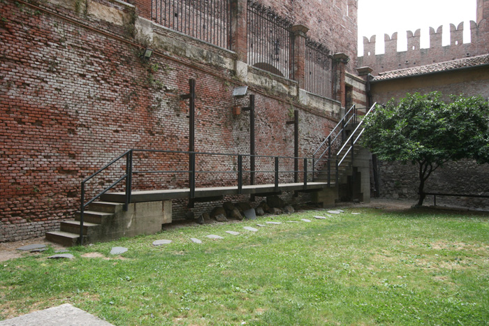 Scarpa mandó demoler por completo un fragmento angosto de la fachada, para poner al descubierto las diversas capas ocultas del edificio. El convierte esta abertura en el lugar de síntesis de toda la obra y la destaca por medio de la estatua de Cangrande della Scala. La estatua se encuentra donde resalta mejor el entrelazamiento histórico; en lo alto, sobre una placa de piedra colocada en diagonal sobre una ménsula de hormigón. Cerca de la entrada, casi ocultu por un muro transversal de hormigón, un pequeño santuario sobresale de la fachada, una capilla votiva en la que están expuestos valiosos hallazgos lombardos. Por fuera está revestida con pequeñas placas de piedra de Prun en diferentes colores y de superficies alternadamente lisa y áspera. En el interior, los muros llevan un enlucido de acabado a la cal color verde botella y el piso está formado por áreas de ladrillo enmarcadas en hierro.