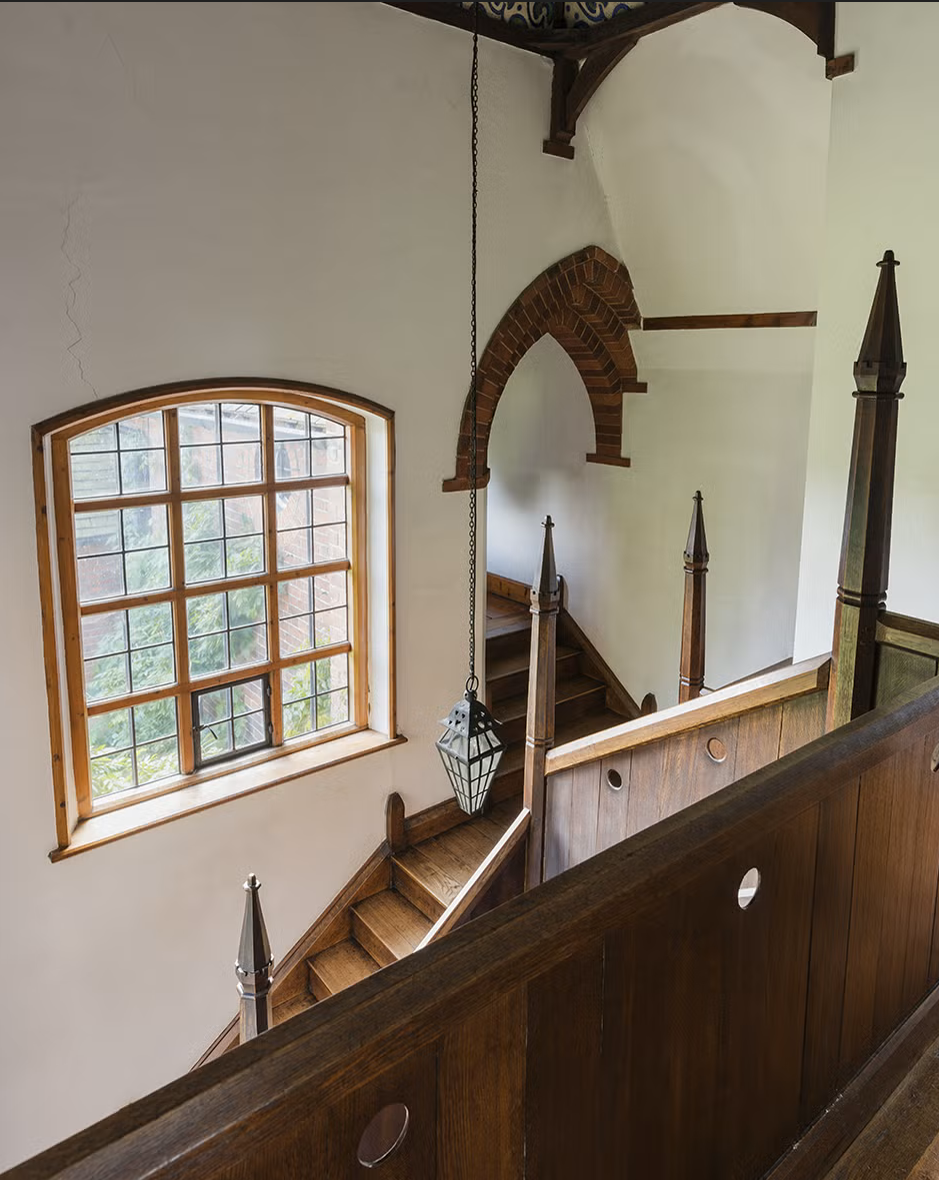 En sus interiores se muestra aun más atrevido e independiente (fig. 12). El detalle es deliberadamente áspero y rústico. Algunos fragmentos individuales pueden estar muy ornamentados, como por ejemplo con pinturas realizadas por los amigos prerrafaelistas de Morris y de Webb , pero otras partes son exaltadas en su pureza sin temor, dando su mensaje sin frases prestadas.