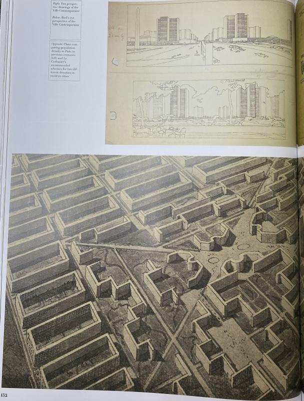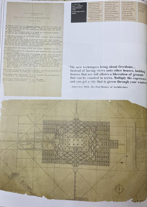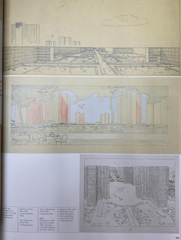 Algo típico del enfoque intelectual de Le Corbusier era que al mismo tiempo que concebía la casa Citrohan estaba perfilando los planos de toda una ciudad moderna, 'La ciudad contemporánea de tres millones de habitantes' . Ésta se expuso en el parisiense Salón de Otoño de 1922. Las ideas políticas y filosóficas que hay tras el urbanismo de Le Corbusier se estudian con más detalle en el capítulo 14; aquí basta con señalar que la arquitectura y el urbanismo eran para él intereses solapados, impulsados por una única visión de la tecnología como una fuerza progresista que, guiada por los ideales correctos, podía reinstaurar un orden natural y armónico. A esta visión utópica - cuyas raíces estaban en pensadores del siglo XIX como Charles Fourier, Henri Saint-Simon y Ebenezer Howard se le dio forma en la 'Ciudad Contemporánea', una ciudad de rascacielos en un parque donde las técnicas de la construccion moderna,los automóviles y los aviones se agrupaban en un diagrama ordenado, con la naturaleza y la máquina reconciliadas y armonizadas.