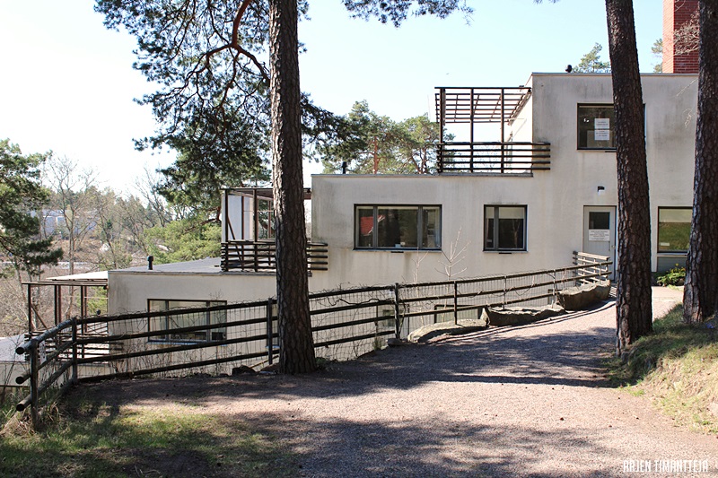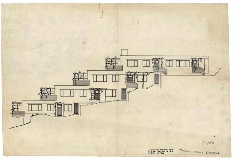 Sólo se construyó una fila de casas, debido a la falta de dinero y materiales. La cuestión realmente importante aquí no es esta única fila de casas, sino la realización de todo el plan, una de las mejores propuestas para la configuración de un asentamiento rural. Se habían planeado cuatro filas de estas casas escalonadas, colocadas de modo que se utilizasen perfectamente las formas naturales de la pendiente. La “ceja” de la colina – como le gustaba entenderla a Frank Lloyd Wright – queda intacta. Conectados con estas piezas hay una escuela y un pequeño centro comunitario y, más abajo en la pendiente, cerca del río, unos baños de vapor (la sauna) construidos, como era habitual, junto con la lavandería colectiva, la primera instalación que se levantó. Esto corresponde a una antigua costumbre de los finlandeses: empezar con la pequeña cabaña de la sauna antes de construir la vivienda. Este primer proyecto de casas contínuas siguiendo la pendiente de una colina llegó a ser de uso generalizado en la década siguiente, con formas cada vez más complicadas.