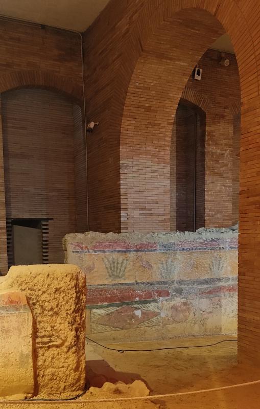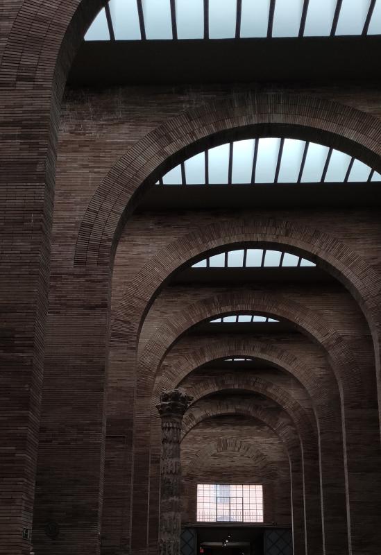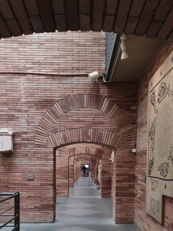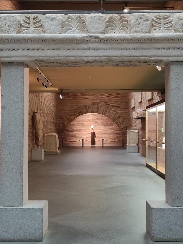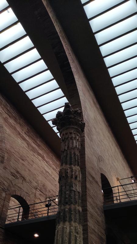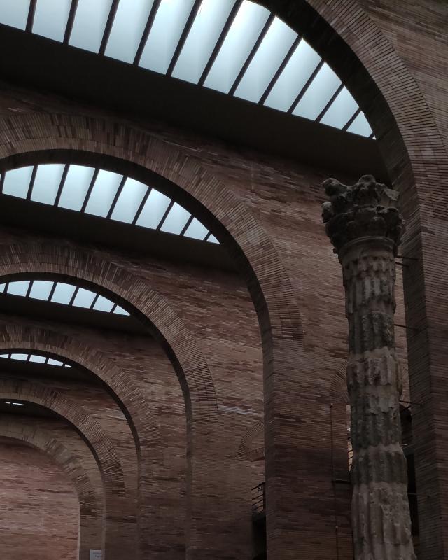 La geometría del museo estaba girada unos cuantos grados con respecto al trazado de la calle romana que pasa por debajo y esto acentuaba el contraste entre lo nuevo y lo viejo. En estas partes subterráneas, los arcos eran más compactos, más numerosos y menos regulares que arriba; estaban bañados por una débil luz de ultratumba. El resultado era como una cisterna antigua, aunque también venía a la mente Kahn y Piranesi. El enfoque de Moneo era ecléctico en todo el sentido de la palabra, tomaba imágenes e ideas de varios períodos y las fundía o las juntaba en un collage.