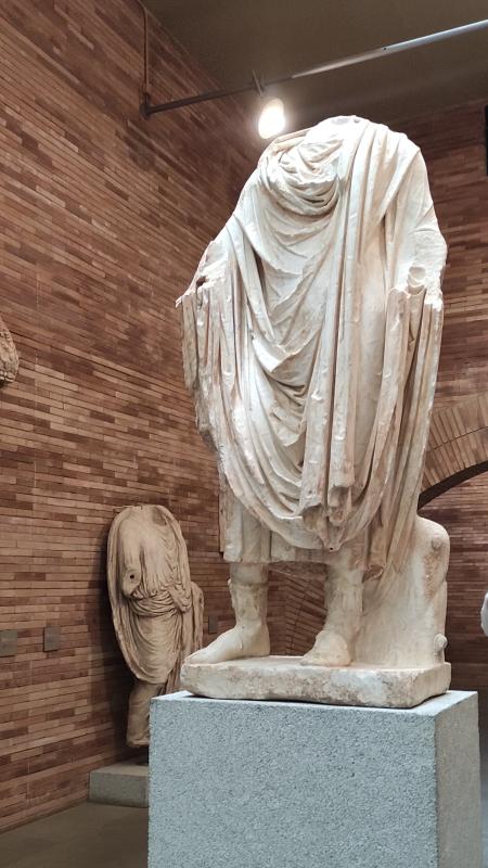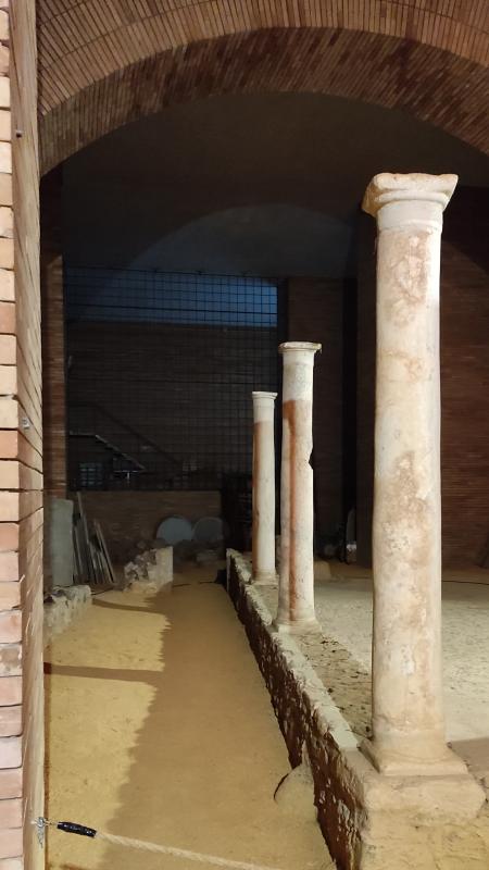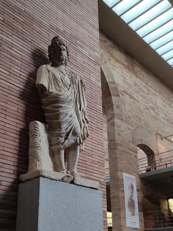 El acceso se realiza por un cuerpo autónomo que alberga en sus distintos pisos los servicios públicos del museo así como la administración. El edificio del museo está definido por la relación dialéctica entre la estructura de los muros y los recorridos que los van atravesando, configurándose en la planta baja un enorme vacío longitudinal, creado por una secuencia de gigantescos arcos de medio punto, que otorga el carácter monumental y emocionante al espacio interior. El proyecto se apoyaba en la repetición insistente de unos muros paralelos de hormigón recubiertos de ladrillo romano, que estaban perforados por arcos de distintos tamaños y rematados por lucernarios industriales y cubiertas de teja. El resultado era una sala noble y espaciosa, donde la perspectiva de los arcos principales, con las filas de soportes en escorzo, centraba la atención en unas estatuas de mármol blanco, fragmentos antiguos y objet trouvé de la columna clásica. Las distancias eran difíciles de calibrar y el efecto de ilusión espacial quedaba dramatizado por un rayo de luz que caía sobre el muro del fondo, procedente de una fuente de luz “invisible”A uno de los lados, unos forjados de hormigón cortaban la estructura principal proporcionando niveles superiores de menor escala para la exhibición de joyería, alfarería y mosaicos, con las ventanas, las puertas y las barandillas de acero tosco. La iluminación natural, se consigue de diversas maneras para lograr diversas atmósferas dentro de la homogeneidad espacial.