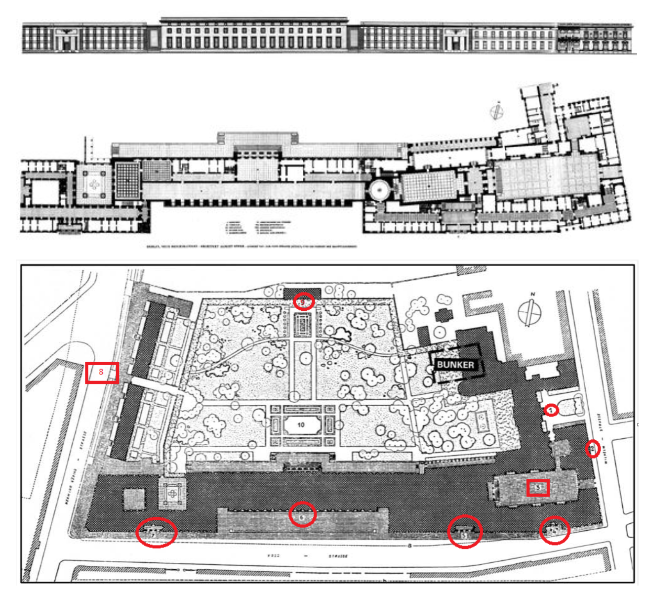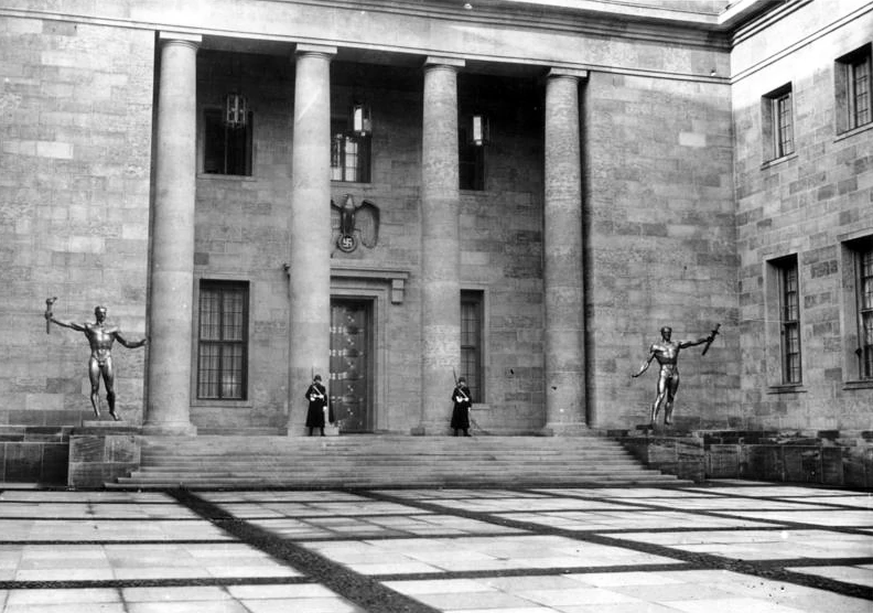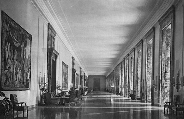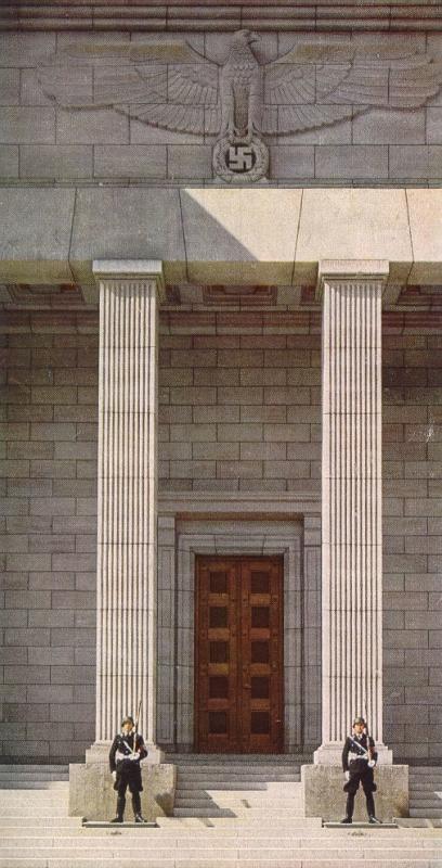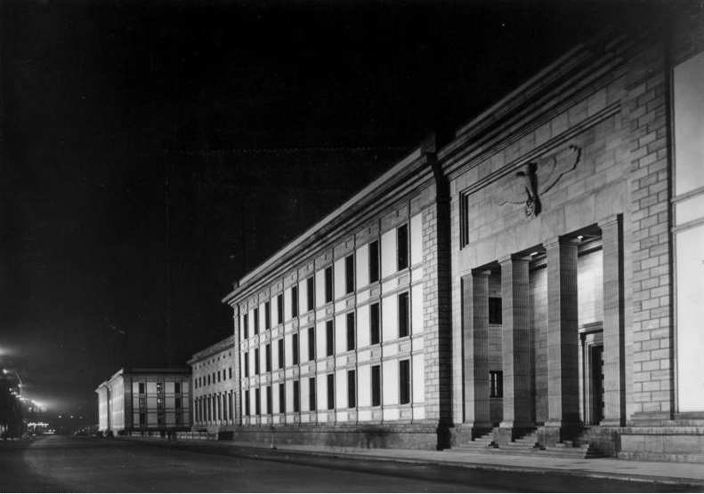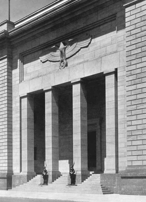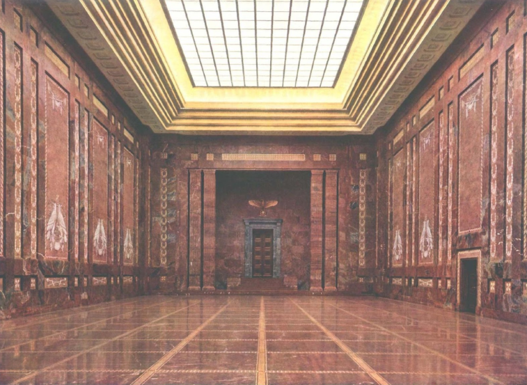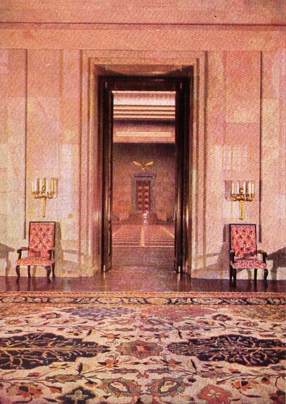La iluminación nocturna de ese patio caía únicamente sobre los cuadrados que contenían las columnas enrasadas y las ventanas, sin decoración alguna, de modo que el visitante vespertino contemplaba cuadros alternos de luz y oscuridad mientras una línea de cornisa nítida y continua unificaba todo el espacio (esta sección de la Cancillería recuerda inevitablemente al ‘patio de la escalera’ diseñado por Edwin Lutyens para la Casa del Virrey de Nueva Delhi. Las soluciones estéticas empleadas por Speer en la Cancillería recuerdan parcialmente a Schinkel, por ejemplo a los paños murales del Altes Museum o al robusto proteico aplanado de pilares daricos de la Elisabethkirche. La diferencia, el exceso propio de Speer, reside en una abstracción formal que carece de referentes antroicos ( por ejemplo, el Patio de Honor, donde las dos esculturas de Arno Breker parecen tan perdidas como las de Georg Kolbe o Wilhelm Lehmbrick en los edificios de Mies van der Rohe), o en la prolongación espacial y la repetición seriada ( por ejemplo, en la Galería de Marmol). En ambos casos, se trata de recursos que son específicos de la arquitectura moderna del siglo XX.