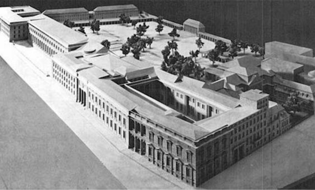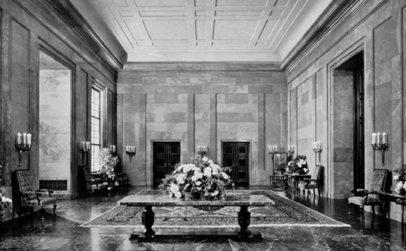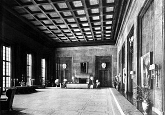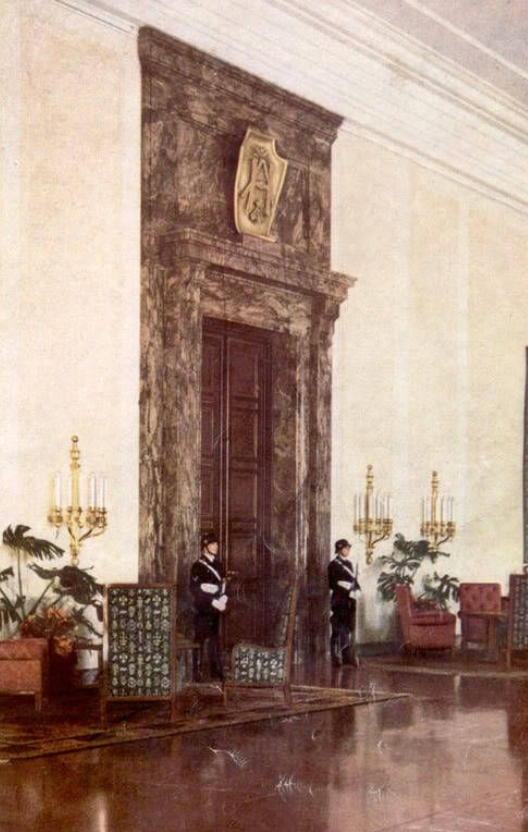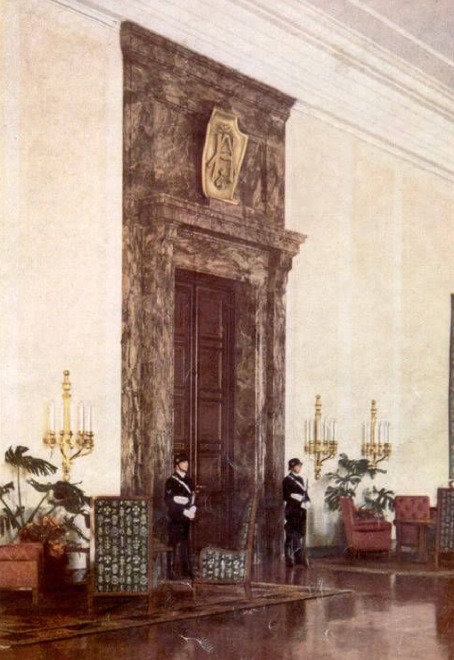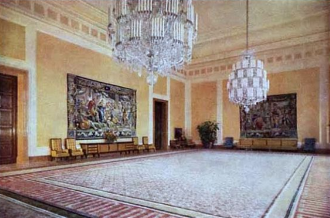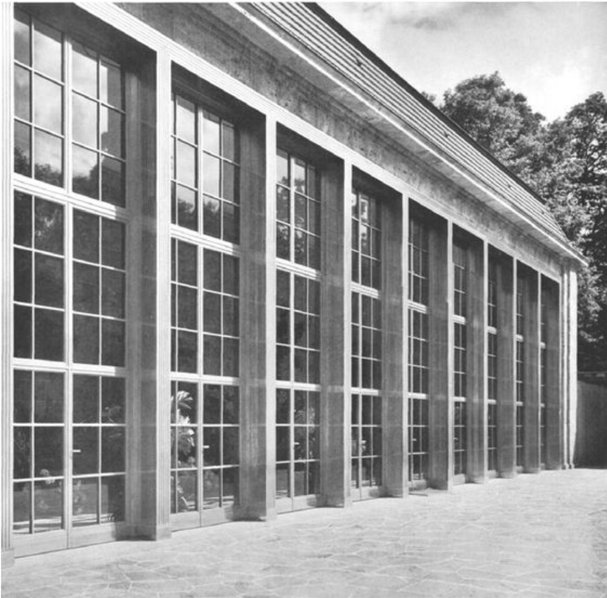 La iluminación nocturna de ese patio caía únicamente sobre los cuadrados que contenían las columnas enrasadas y las ventanas, sin decoración alguna, de modo que el visitante vespertino contemplaba cuadros alternos de luz y oscuridad mientras una línea de cornisa nítida y continua unificaba todo el espacio (esta sección de la Cancillería recuerda inevitablemente al ‘patio de la escalera’ diseñado por Edwin Lutyens para la Casa del Virrey de Nueva Delhi. Las soluciones estéticas empleadas por Speer en la Cancillería recuerdan parcialmente a Schinkel, por ejemplo a los paños murales del Altes Museum o al robusto proteico aplanado de pilares daricos de la Elisabethkirche. La diferencia, el exceso propio de Speer, reside en una abstracción formal que carece de referentes antroicos ( por ejemplo, el Patio de Honor, donde las dos esculturas de Arno Breker parecen tan perdidas como las de Georg Kolbe o Wilhelm Lehmbrick en los edificios de Mies van der Rohe), o en la prolongación espacial y la repetición seriada ( por ejemplo, en la Galería de Marmol). En ambos casos, se trata de recursos que son específicos de la arquitectura moderna del siglo XX.