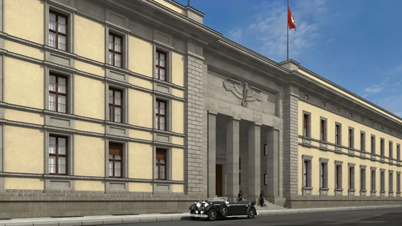 En la Nueva Cancillería, Speer ensayo una novedosa versión del clasicismo simplificado, claramente presente en el reticulado diagramático de las fachadas, cuya alternancia de paños ciegos y ventanas nítidamente fijadas y organizadas remitía también al racionalismo del periodo precedente.Las columnas del Patio de Honor se enrasaban sorprendentemente con el muro y se apoyaban sobre unos plintos continuos que se interrumpan justo antes de llegar a las esquinas de la fachada principal del patio.
