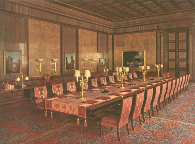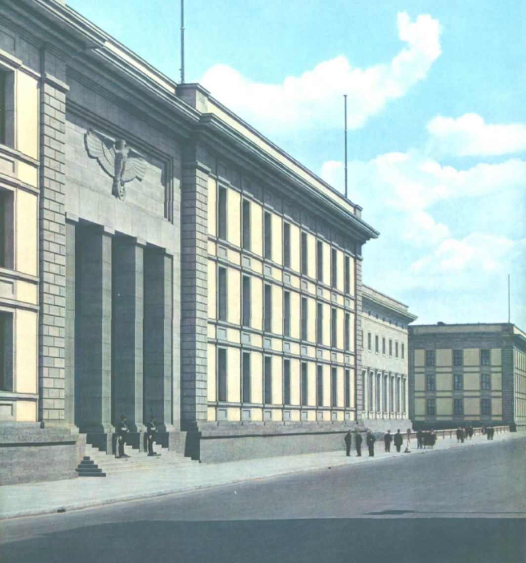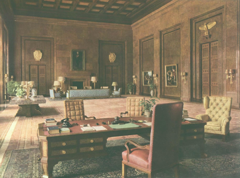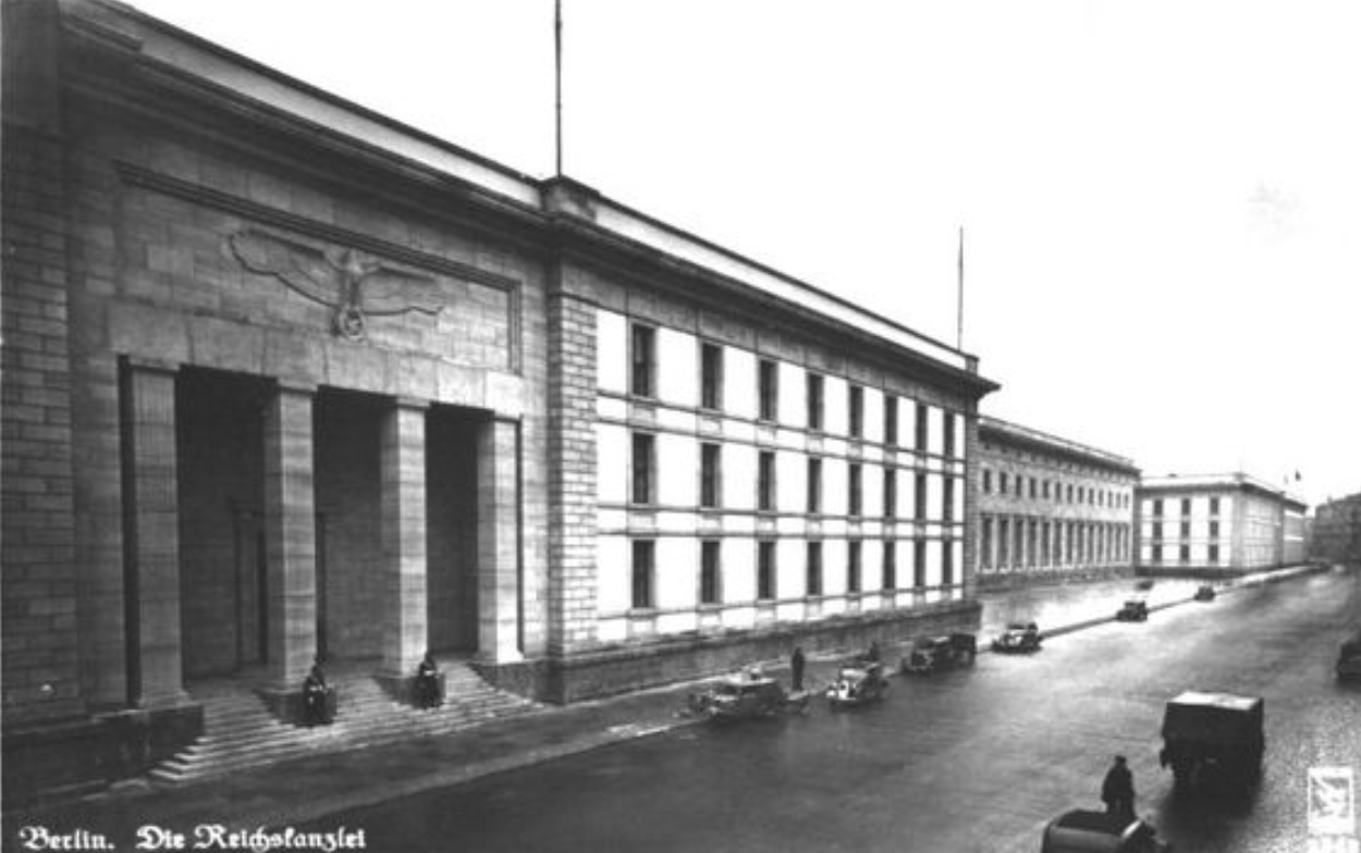 A principios de 1938 Speer ya había conquistado por completo la confianza de Hitler, y recibió el encargo de proyectar y construir en el plazo exigido de un año una nueva sede para la Cancillería (Reichskanzlei) que se adecuase a la imagen grandiosa de Hitler considerada apropiada para el jefe de gobierno de la nueva Alemania. El carácter alargado e irregular del solar disponible y el deseo de crear unos interiores suntuosos y espacios supusieron un severo pie forzado que Speer afrontó cuando una sucesión sincopada de episodios y perspectivas.