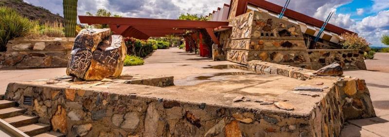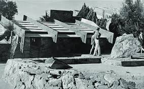 págs. 317-319. Construido en el desierto de Arizona, en Maricopa Mesa, Paradise Valley. En realidad, era un pequeño asentamiento utópico donde la comunidad de Taliesin y la familia de Wright pasarían varios meses cada invierno. El esquema combinaba salas de delineación, un teatro, el patio de los aprendices, residencias y una pequeña sala de reuniones centralizada con la forma de una hogar, choza típica de los indios navajos. Los edificios se entretejían sobre un trazado de espacios interiores y exteriores apoyados en un basamento de pedruscos toscamente labrados y unidos con mortero.
