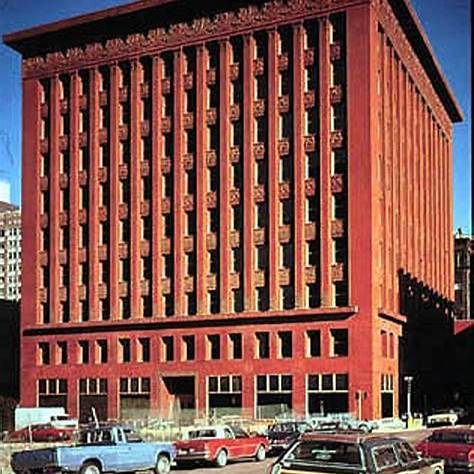construcción en esqueleto y luego, otros bloques de oficinas en Chicago tal como el Tacoma Building (1887-88) de Holabird y Roche, mejoraron en seguida la innovación de Jenney. Pero exteriormente, ni el Home Insurance, ni el Tacoma Building, ni los demás de los primeros rascacielos de Chicago, muestran un aspecto más avanzado que las acostumbradas torres de mampostería levantadas con anterioridad. Quedaba reservado a Sullivan el prestar atención a la voz del acero. El resultado es el Wainwright Building de St. Louis, piedra fundacional en la evolución del Movimiento Moderno. Fue diseñado en 1890. Mr. Morrison ha puntualizado con acierto que sus fachadas de ningún modo muestran la construcción en su integridad. Todavía las fajas de mampostería de las esquinas son más anchas que las demás y todas las restantes tienen el mismo ancho a pesar de que solamente a cada dos de ellas corresponde un puntal de hierro. El último piso, con sus ojos de buey y la cornisa superior ampliamente proyectada con una lozana y personal decoración Art Nouveau, también tienen reminiscencias de la tradicional construcción en piedra. Sin embargo, Sullivan ya había comprendido que la grilla de acero requiere un exterior basado esencialmente en un mismo elemento o, como él expresara, debemos "partir de la célula individual, la cual requiere una ventana con su parante de separación, su alféizar y su dintel y sin más rodeos, tratarlas todas igual porque son iguales". De aquí la espléndida simplicidad de ritmo y la resuelta precisión de su efecto. En contraste con van de Velde, Sullivan trasladaba así, ala realidad de los grandes edificios aquellas teorías revolucionarias suyas que hemos discutido al comienzo de este libro.